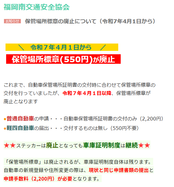 令和7年4月1日から、保管場所標章(いわゆるステッカー)は廃止されています。